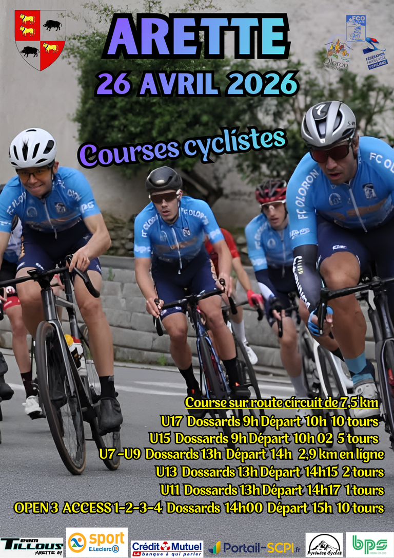 Oloron Sainte Marie le 29 mars 2026 - École de cyclisme - U9 : Gaspariau Mahé 1er - U11 : Kalinitchev Henri 13ème - U13 : Pestana Anthony 8ème - U15 : Mora pierre 2ème, Dominique Jonaès 3ème - Résultats et photos.