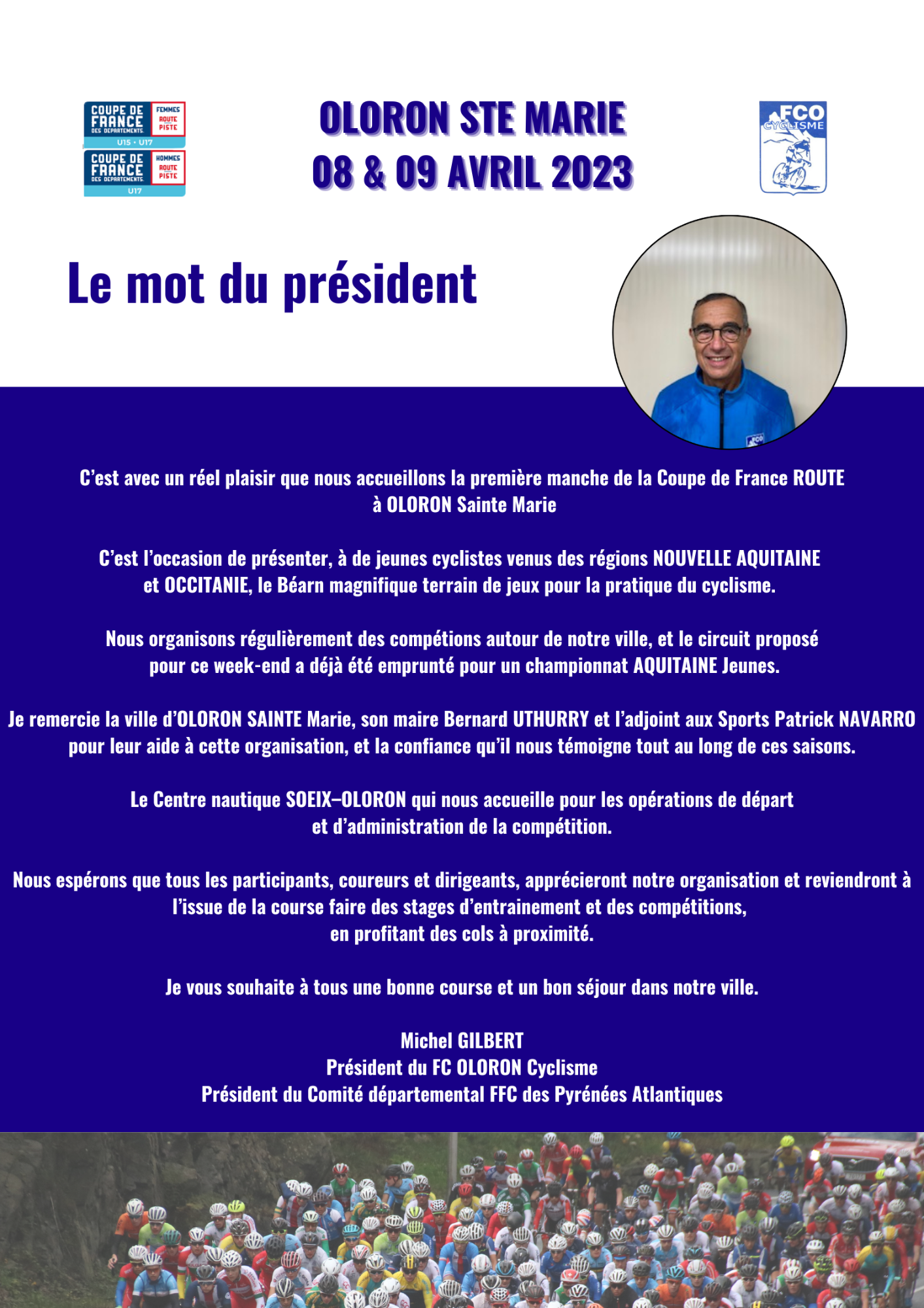 Le FC Oloron cyclisme à l'honneur de vous annoncer qu'il a été choisi pour l'organisation de la première étape de la coupe de France U17 2023.